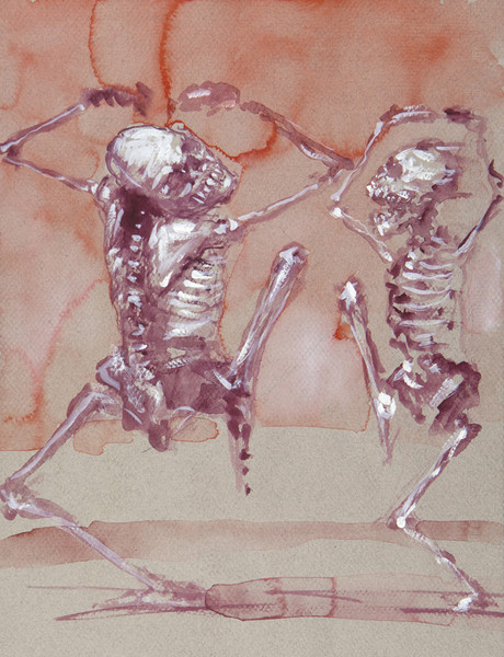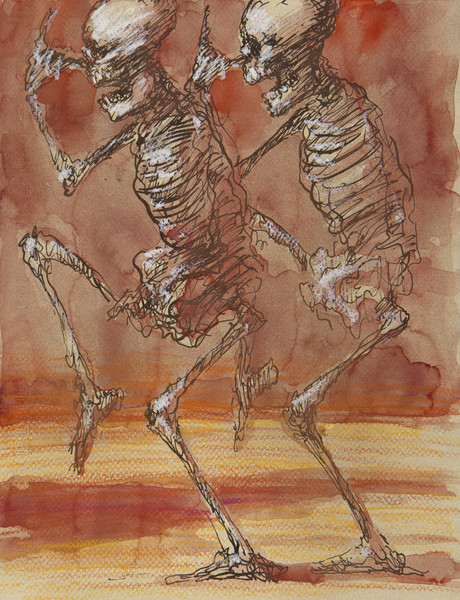 „Béla Faragó schildert mit zeichnerischen Mitteln, wie nah wir Lebenden dem Tode sind. Da tanzen Gerippepaare einen ekstatischen Tanz, einem ungarischen Csárdás gleich. Einige musizieren dabei. Der Künstler reiht sich mit einem solchen Sujet in eine Tradition ein, die in der Malerei um 1400 begann und im Westen Europas Verbreitung gefunden hat" (Dr. Claus Pese)