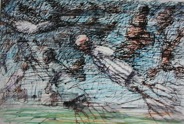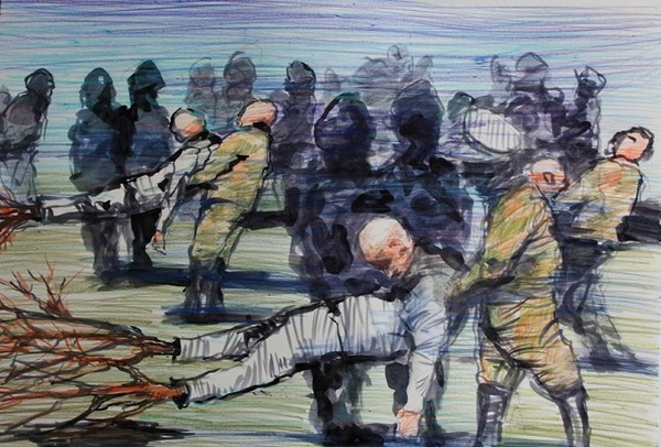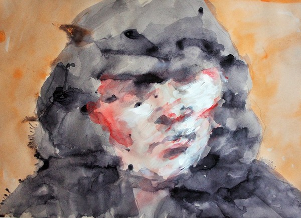 Die Meditation bildete auch die Grundlage für den Zeichenzyklus “Grabtücher” (poln. Całuny). Viele dieser Reisereminiszenzen entstanden nicht im Kunstatelier, sondern in Eisenbahnwaggons, Bahnhofshallen oder Flughafenterminals. Düster wie die Nacht im Pariser 13. Arrondissement, bedrückend, deprimierend und vollgepackt mit Aggressivität wie ein nächtlicher Spaziergang durch Omonia in Athen oder Berlin-Neukölln. An die Stelle der auf dem Grabtuch Christi sichtbaren Wunden treten nun die Wunden der heutigen Zivilisation der Ausgrenzung. Statt der im Turiner Grabtuch durch mysteriöse Kraft eingebrannten Blutflecken sehen wir eine grafische Niederschrift, ob es jedoch eine Aufzeichnung des Todes oder der Auferstehung ist, bleibt dahingestellt.